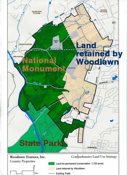 Open space for the Concord supervisors, developers, and Woodlawn is a very different concept indeed. For them, open space can have power lines over it, be a playing field, or consist of a drainage basin, or a strip of grass along a road. For them, it can fall within the fenced-in area of a commercial operation, or trapped within the perimeter of a development, unusable to everyone and off limits to anyone who doesn't live in those homes. Their open space contains no old trees and is stripped of its most natural qualities. It supports virtually no wildlife, as there is no food anywhere for them to eat. It is most likely treated with landscape chemicals, and is not much of a buffer against the contamination of our streams and rivers. If it has hiking trails, they're most likely paved with asphalt or lie under power lines or in the midst of a dense neighborhood. In short, open space to them is just a piece of sterile land colored green that represents unrealized profits.