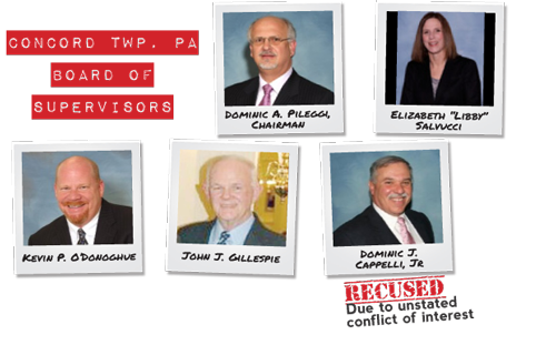 In addition to demonstrating a disdain for community input, two of the supervisors in particular have shown a disdain for zoning law even as they stand ready to approve an outrageous change in Concord zoning. For years, Dominic Cappelli operated a heavy commercial business in a residential neighborhood on School House Lane. Many local Concord residents along School House Lane and Andrien Road opposed this violation of zoning law, taking their case to court. After a lengthy legal fight, a state appellate court issued an order to cease commercial operations on School House Lane. For years, the Concord supervisors ignored the order issued by Judge Doyle and allowed commercial operations to continue in a residential neighborhood. All the while, Dominic Cappelli sat on the Board of Supervisors.