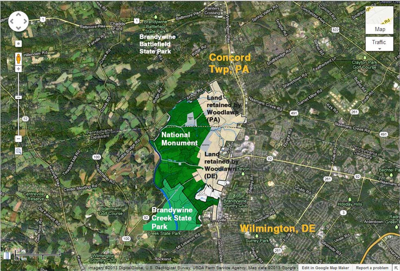 In April of 2013, a large portion of the Woodlawn trust was purchased, funded by the Mount Cuba Foundation, a preservation organization in Wilmington, and then donated to the federal government to be preserved in perpetuity.
