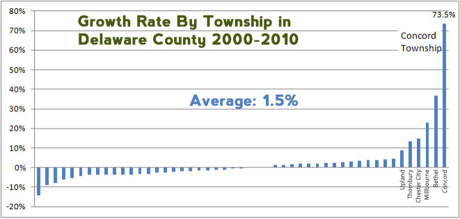 Likewise, the supervisors have approved several unwelcome commercial properties over intense community opposition. These have increased the traffic load on township roads by several orders of magnitude. The supervisors have claimed that the commercial and residential development has benefitted the township and school district by increasing the tax base. The reality is that the various bonds the district has had to float to pay for school expansion has left the district 112 million dollars in debt. School district taxes have gone up exponentially over the last 13 years as a result of this unprecedented growth, something which the supervisors see as something to celebrate on the township's website. Concord township is the fastest growing municipality in Delaware County, at almost 50 times the county average. At this rate, if we haven't yet seen the benefits of development, we never will.