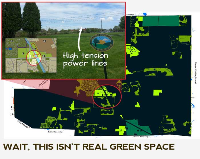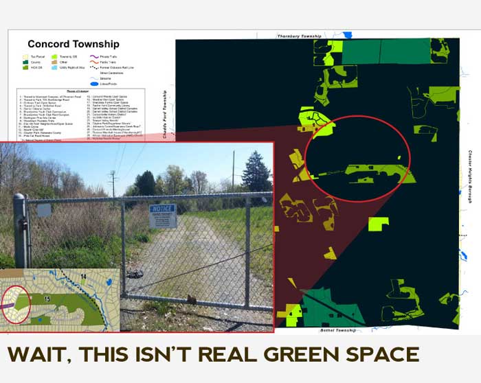 Take a look at the map (above) of green space in Concord township. At a glance it looks like Concord has done an excellent job in creating green space for the public good, but a closer examination shows that this is not true at all. Most of the land presented as "open space" is not true open space. In some cases, they count the tiny lawn areas in between houses in a dense housing development as open space. Is this a joke or a lame attempt at meeting the open space requirements of the township?