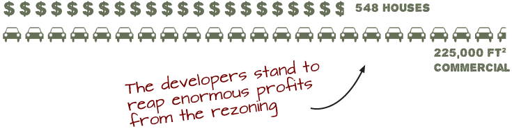 The developers stand to reap enormous profits from the rezoning. This goes far beyond reasonable development. To get an idea of the density of development they're proposing, the following graphic illustrates is the difference between the current zoning and the rezoning proposal.