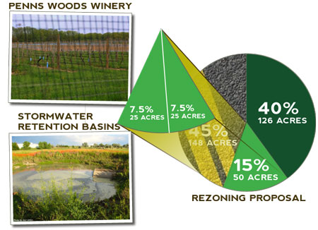 Let's take a closer look. Out of the 50 additional acres they give us in exchange for hundreds of additional houses, half of that land is the Penns Woods Winery which is an enclosed area that's not open to the public, and the other half are storm water retention basins and steep slopes. Neither of these can be regarded as true open space.