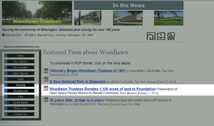 The threatened 324 acres was purchased from various landowners over the last sixty years by an organization called The Woodlawn Trustees whose original mission, as envisioned by its founder William Bancroft, was to protect open space for public recreation. That Woodlawn would sell this tract to developers is a betrayal of not only William Bancroft but those landowners from whom it originally purchased the various pieces of the tract. A DuPont chemist named Merlin Brubaker owned over 50 acres in Beaver Valley and wanted to have it protected. Turning down offers from real estate developers, he instead contacted the Woodlawn Trust in the late 1970s with the conservation of his estate in mind. Stephen Clark, at that time the president of Woodlawn, wrote to Brubaker thanking him for adding his land to that "which Woodlawn tries to protect." Consistently, many landowners along the PA/DE border were assured by Woodlawn that their land would be protected.