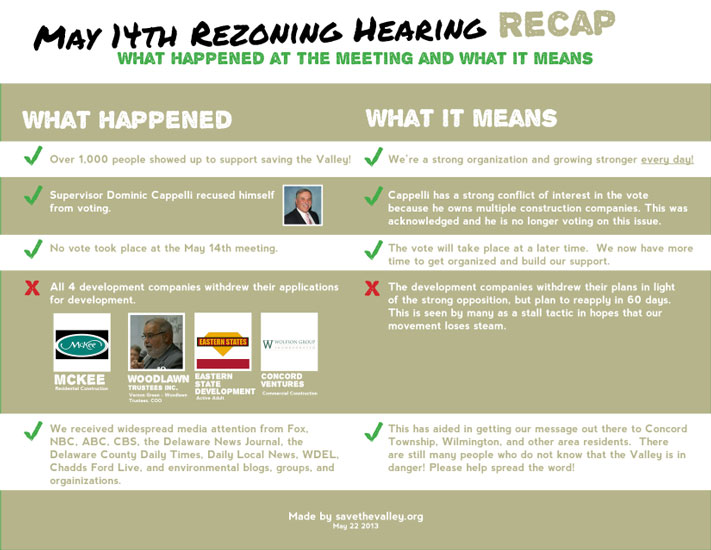 The supervisors have made many decisions without regard to citizen input even though these decisions directly impact residents in the township.The frustration resulting from this in large part has helped to galvanize opposition to the development plans in Beaver Valley. When Save The Valley and other groups went door to door in Concord in early May alerting residents to the planned destruction of this beautiful place, positive responses were overwhelming. As a result, upwards of one thousand people turned up at the May 14th rezoning hearing at Garnet Valley Middle School to show their opposition to the proposal.
