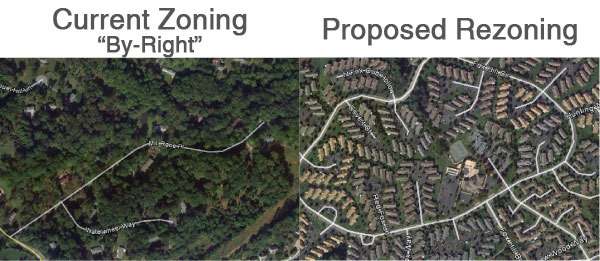 However, the development companies cannot build as planned because the law only allows a fraction of what is proposed. The developers have submitted a "rezoning proposal" in order to accommodate their proposed development. In other words, they are submitting a request to change the law in order to allow for an enormous increase in development so they can maximize their profits.