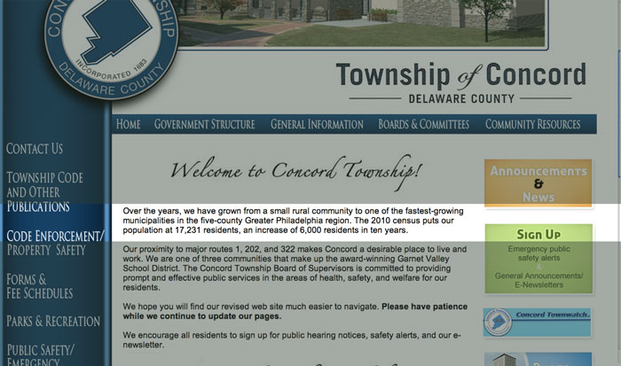 Likewise, the supervisors have approved several unwelcome commercial properties over intense community opposition. These have increased the traffic load on township roads by several orders of magnitude. The supervisors have claimed that the commercial and residential development has benefitted the township and school district by increasing the tax base. The reality is that the various bonds the district has had to float to pay for school expansion has left the district 112 million dollars in debt. School district taxes have gone up exponentially over the last 13 years as a result of this unprecedented growth, something which the supervisors see as something to celebrate on the township's website. Concord township is the fastest growing municipality in Delaware County, at almost 50 times the county average. At this rate, if we haven't yet seen the benefits of development, we never will.