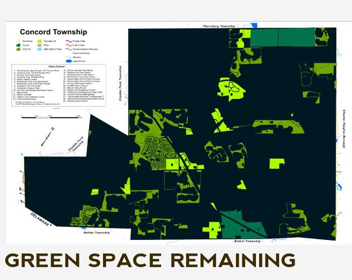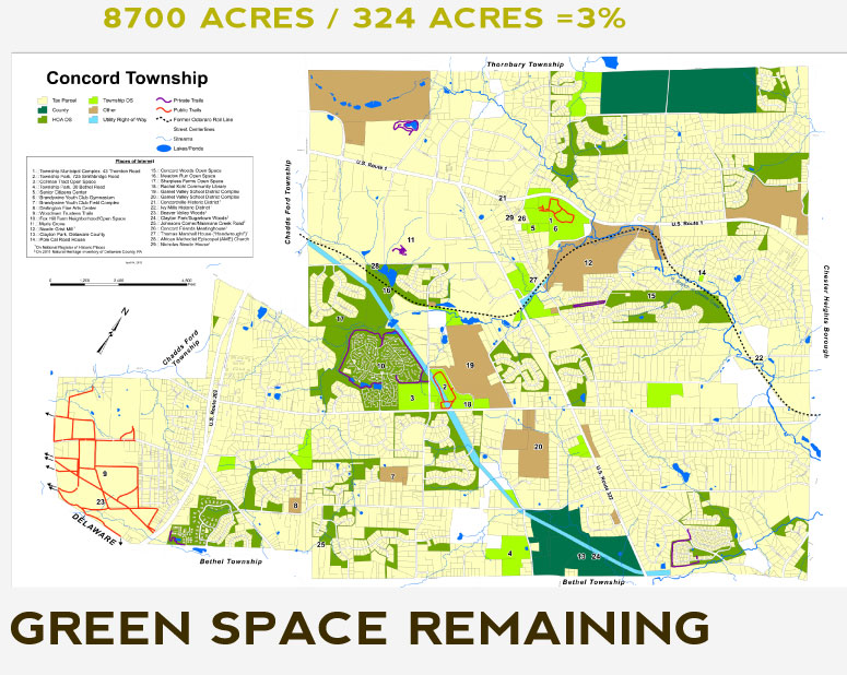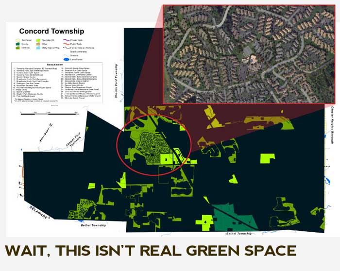 Take a look at the map (above) of green space in Concord township. At a glance it looks like Concord has done an excellent job in creating green space for the public good, but a closer examination shows that this is not true at all. Most of the land presented as "open space" is not true open space. In some cases, they count the tiny lawn areas in between houses in a dense housing development as open space. Is this a joke or a lame attempt at meeting the open space requirements of the township?