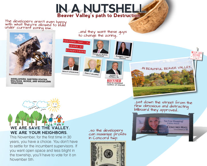 It's a complicated issue, but it can be boiled down to the graphic on the right. The developers aren't happy with what they can build in Beaver Valley under current zoning law so they want the Concord Board of Supervisors to change the zoning so the developers can maximize profits.