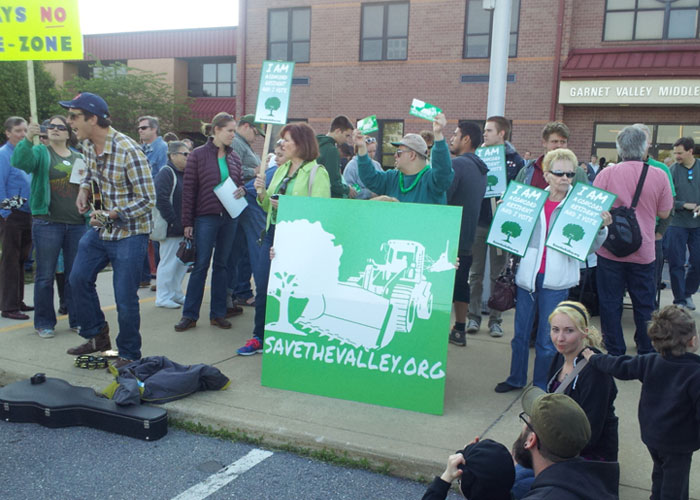 The hearing took place at the Garnet Valley Middle School auditorium, and turned out almost a thousand people. There were pickets and petitions in protest, public displays, and protest songs. Right before the start of the meeting we were informed that all four developers withdrew their proposals.