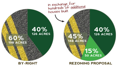 Concord Township laws require that 40% of a parcel that is developed with five or more houses be maintained as open space. Other regulations limit building on steep slopes and in wetlands. The concord township supervisors and developers claim that we'll get more open space with the rezoning proposal than with the by-right. THIS IS NOT TRUE.