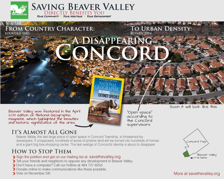 The supervisors have made many decisions without regard to citizen input even though these decisions directly impact residents in the township.The frustration resulting from this in large part has helped to galvanize opposition to the development plans in Beaver Valley. When Save The Valley and other groups went door to door in Concord in early May alerting residents to the planned destruction of this beautiful place, positive responses were overwhelming. As a result, upwards of one thousand people turned up at the May 14th rezoning hearing at Garnet Valley Middle School to show their opposition to the proposal.